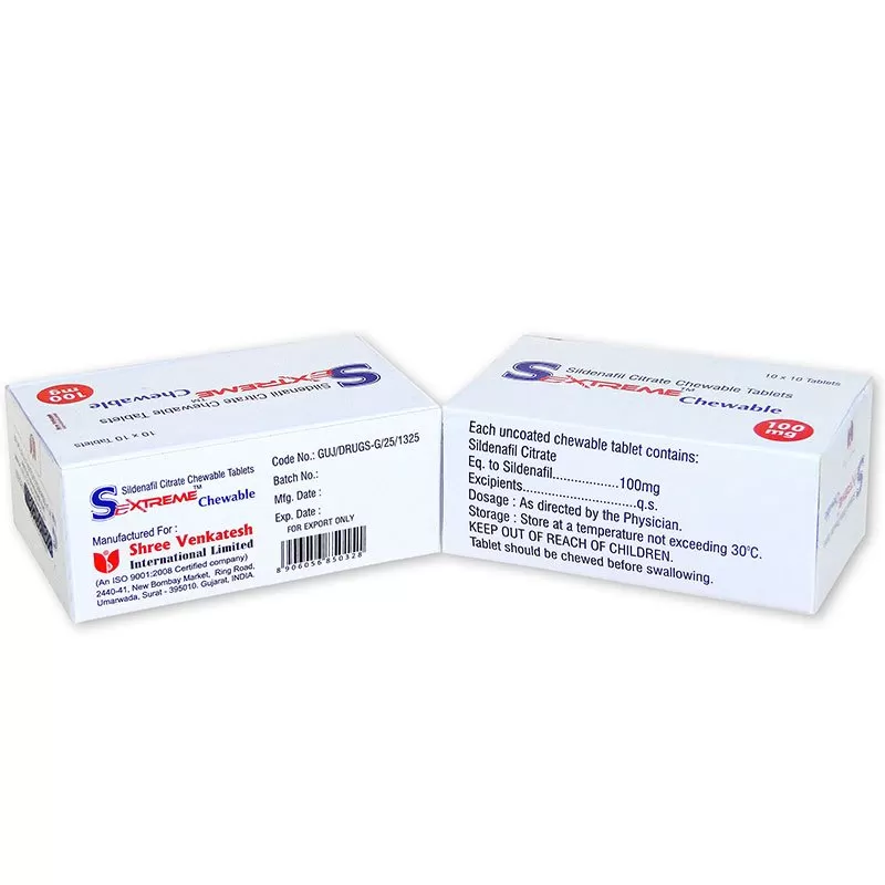 Cada unidad de Sextreme Chewable 100mg está compuesta por 100 mg de Sildenafil, que está combinado con otros ingredientes especiales, que hacen que su consumo sea el indicado para cada encuentro sexual.